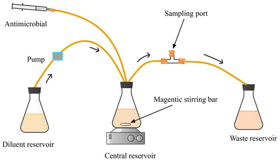 The setup in the one-compartment infection model consists of a central reservoir, diluent reservoir, peristaltic pumps, and waste reservoir, as illustrated in Figure 1 [17,28,30].