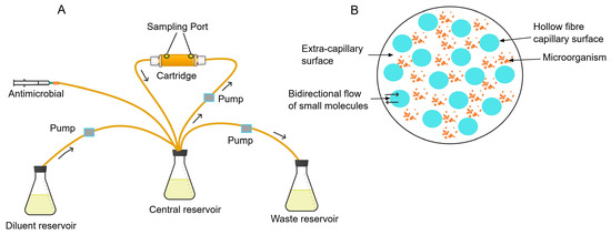 The microorganisms are introduced into the ECS of the cartridge via the sampling port (Figure 3A) [50]. The semi-selective pores of the fibres enable the exchange of gases, nutrients, metabolic wastes, and antimicrobials while retaining the infecting organisms in the ECS [51]. By retaining microorganisms in the ECS, their loss and dilution during pharmacokinetic decay are avoided, unlike in the one-compartment model. The antimicrobial is usually administered to the central reservoir with a syringe pump in a dosage mimicking its intended regimen for clinical use [52]. The drug solution in the central reservoir is pumped to the cartridge with a pump (e.g., duet pump) at a high flow rate (80–120 mL/min) to ensure the rapid distribution of the antimicrobials and nutrients into its ECS containing the microorganism [32]. The fluid in the cartridge is pumped back to the central reservoir. Similarly, the growth media from the diluent reservoir is pumped into the central reservoir at a rate equivalent of the clearance of the drug, mimicking the half-life of the antimicrobials. Simultaneously, drug-containing growth media from the central reservoir is pumped out to the waste reservoir [53]. The equivalent rate of renewal and removal of growth media from the central reservoir keeps a constant volume of distribution in the central compartment. Similar to the one-compartment model and all dynamic PK/PD models per se, calibration of the pumps and adjustment of the flow rate of media based on the desired pharmacokinetic profile of the antimicrobial is critical to ensure appropriate antimicrobial exposures are evaluated by the model. Fluid samples can be taken from the central compartment or the ECS to confirm the simulated pharmacokinetic profile of the test antimicrobials [14].
