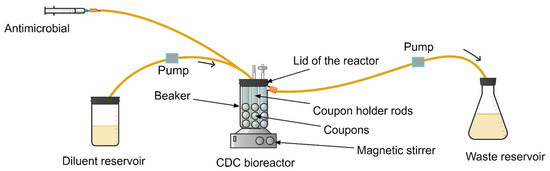The batch phase of the biofilm model allows the initial bacterial growth and the attachment of biofilm-forming bacteria on the surface of the coupons in the reactor. Before starting the batch phase, a single colony of bacteria from an overnight incubated agar plate is inoculated into Tryptic Soy Broth (TSB, 100 mL) and incubated for 24 h in a shaking incubator. To initiate the batch phase, first, the reactor is placed on stirrer hot plate or on a magnetic stirrer in an incubator. The inoculum injection port is flushed with TSB using a luer syringe to ensure that inoculum reaches the batch media (500 mL of TSB). Then, 1 millilitre of the 100 mL overnight culture bacterial inoculum is injected into the reactor containing TSB to achieve an inoculum concentration ~1 × 108 CFU/mL. The stirring bar of the reactor is rotated at 125 RPM for 24 h to initiate bacterial attachment on the surface of the coupons. It is important to control the rotation rate of the stirrer bar to ensure an optimal shear stress to allow the attachment of bacteria on the surface of the coupons and maintain a good density of the viable biofilm [33,81].