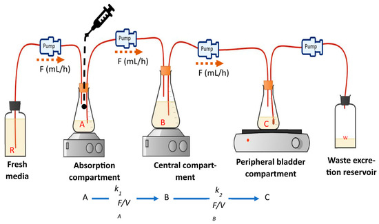 The dynamic in vitro bladder infection model is an automated system designed to control the rate of urine formation and micturition over an extended period, simulating the urodynamic features of the bladder [94,95]. The mimicry of human urodynamics is achieved through the use of peristaltic pumps integrated into the model [92]. As depicted in Figure 6, the model includes various reservoirs representing the intestinal compartment, the circulatory compartment, and the bladder, all interconnected by tubes [94,96].