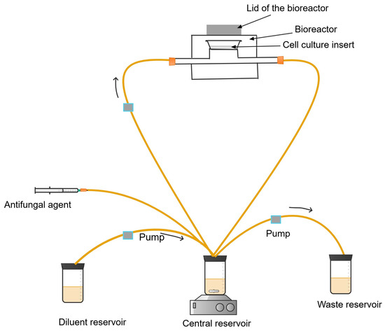 The schematic of the fluid circulation of the model is presented in Figure 7. The in vitro bilayer cell culture of the endothelial and alveoli cells in a bioreactor is prepared using cell culture well inserts [102,103,105]. The alveolar surface of the bilayer cell culture is then inoculated with the fungal suspension of 1–3 × 104 conidia/ml [103]. The cell culture insert is housed in a stainless steel bioreactor [103,105] and incubated at 37 °C [103,104]. The assembled bioreactor is connected to the central reservoir containing the antifungal agent through a connecting tube (Figure 7) [103,104].