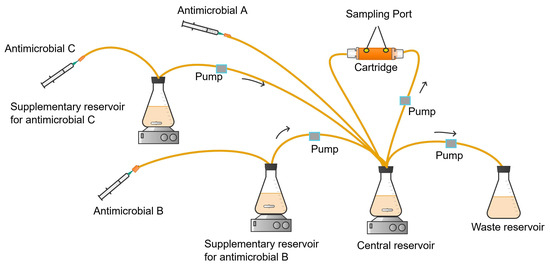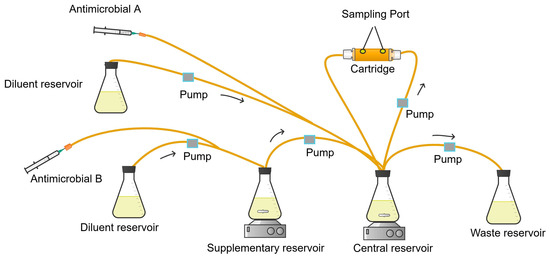 When simulating the pharmacokinetics of oral regimens, an additional reservoir (antimicrobial reservoir) is added between the diluent reservoir and the central reservoir (Figure 2). The antimicrobial solution is administered to its reservoir (Figure 2) to simulate the gastrointestinal absorption of the drugs [28] after oral administration.