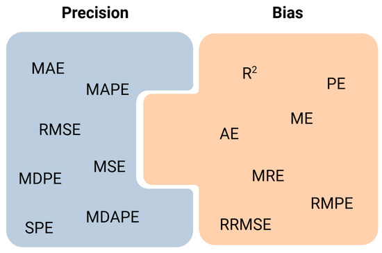 With the aim of clarifying this aspect and facilitating the understanding and interpretation of the results obtained in the articles collected in this review, Table 2 shows all the statistical metrics used in the articles analyzed, as well as their possible abbreviations, formulas, definitions, and interpretations. There are different ways to measure errors [59,60]. The simplest is to measure it like a difference. Within this type are the prediction error (PE) and the absolute prediction error (AE), which is the same as the previous one but in terms of absolute value. Another widely used possibility is to use square errors (SPEs) or root square errors (RMSEs). Squaring the error gives higher weight to the outliers, which results in a smooth gradient for small errors. Another way to express them is by calculating the mean (ME, MAE, MSE) or the median (MDE, MDAE) of all the errors in the sample. These errors present units of concentration (squared concentration units in the case of SPE or MSE) and the desired value would be the minimum possible. Another way to express the error is to express it relative to the range of the target variable (MRE, RMPE, RRMSE). These types of expressions limit the values between 0 and 1, with values closer to 1 being better. Most of these errors can also be expressed as a percentage (PE%, AE%, ME%, or MPE, MAE% or MAPE, MDPE%, MDAPE%, MRE%, RMSE%…), presenting values between 0 and 100. Some of these metrics are more focused on the measurement of accuracy or bias and others on precision, as expressed in Figure 3.