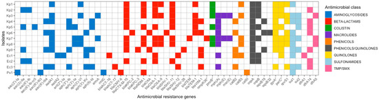 Conversely, in two isolates (Kp1 and Ps1) found to be susceptible to trimethoprim/sulfamethoxazole, we did not detect any of the three resistance genes found in the remaining eleven resistant isolates (dfrA1 in one isolate, dfrA14 in seven isolates, and dfrA6 in three isolates). Lastly, we detected the colistin-resistance-associated mutation pmrB_R256G [13] in six of the thirteen isolates (Kp1 to Kp3, Kp5, and Kp7 to Kp8), including Kp5, one of the two colistin-resistant isolates in the study.