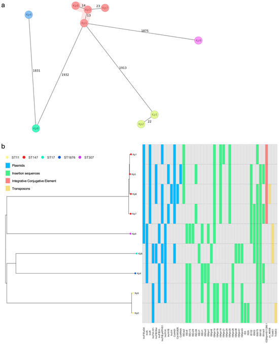As depicted in Figure 2a, Kp1, Kp3, and Kp8 formed a cluster, with Kp1 differing from Kp3 by 13 alleles and from Kp8 by 27 alleles. Kp7 was more closely related to Kp3, differing by 23 alleles. The remaining five isolates were highly distant from this cluster and, apart from Kp2 and Kp5 (which differed by only 22 alleles), were also distant from each other. As depicted in Figure 2b, the matrix of genomic features, including plasmids and mobile genetic elements, is organized according to the core genome phylogeny based on single-nucleotide polymorphisms. Together, these data suggest that the level of evolutionary relatedness among the K. pneumoniae isolates in this study reflects the distinct distribution and transfer profiles of clinically relevant bacterial genes.