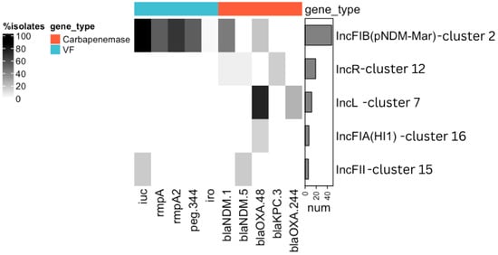 Prevalence of VFs and carbapenemase genes in the identified clusters of plasmids. The clusters of the plasmids were named according to the prevalent replicon gene in this cluster, as shown on the right side of the figure. Only those clusters in which VFs and carbapenemase genes were identified are included in the figure. Genes are grouped by their classification into VFs (blue) or carbapenemase genes (red). Gray shading shows the prevalence of each gene within each cluster. The bar chart on the right side indicates the number of plasmids in each cluster. iuc = iucABCD and iutA genes; iro = iroBCDN genes.