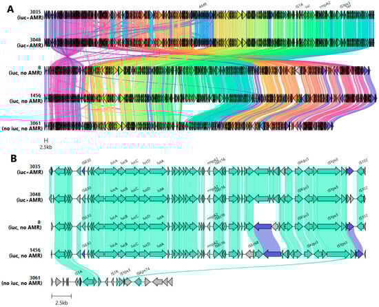 (A) Evolution of IncHI1B(pNDM-MAR)/IncFIB(pNDM-Mar)-like plasmids with/without aerobactin. From top to bottom: alignment of plasmids carrying aerobactin and ARGs (pVKpST512_3035, pVKpST512_3048), plasmids carrying aerobactin (pVKpST147_8, pVKpST395_1456), and one plasmid without the aerobactin cluster (pVKpST512_3061). ARGs, rmpA2, tellurium resistance genes (ter), and the aerobactin gene cluster (iuc) with surrounding MGE are marked at the top. (B) Comparison of upstream and downstream regions of rmp associated with different mobile variants. Arrows represent coding sequences, and those corresponding to genes of interest are labeled. Arrows are colored according to gene clusters, and shading corresponds to regions of similarity (sequence identity ≥ 30%) as identified by clinker. The following were identified: 3035 stands for plasmid pVKpST512_3035, 3048 for pVKpST512_3048, 8 for pVKpST147_8, 1456 for pVKpST395_1456, and 3061 for pVKpST512_3061.