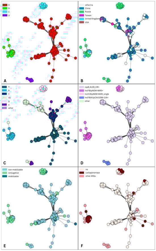 Plasmid similarity network of IncHI1B(pNDM-MAR)/IncFIB(pNDM-Mar)-like plasmids from cluster 2 and the “Global dataset”. For the visual representation of the obtained table with source plasmid node IDs (identification), target plasmid node IDs, and the Jaccard coefficient between them, a graph and a layout for it were generated using the package igraph, where a layout describes the vertical and horizontal placement of nodes when plotting a particular graph structure. Each circle in the figure represents a plasmid, and it is connected with an edge to another node (plasmid) if the Jaccard coefficient between them is greater than 0.8 (see Section 4). Each node (plasmid) is colored according to various features: the assigned cluster (A); the country of origin (B); the sequence of IncHI1B replicon (C); carried replicons, where “+” indicates that a plasmid coded one or more replicons (D); mobility (E); and ARGs (F).