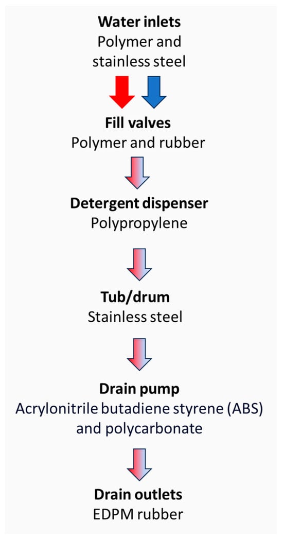 The main chemical components of a washing machine’s construction are stainless steel, synthetic rubber, and polypropylene (PP) (Figure 1). The inner drum of a washing machine, which is the element which moves around and is perforated with holes to allow the water in and out, may be manufactured from porcelain or plastic, but stainless steel is the most common material used due to its durability [10]. The ferritic stainless steel group (series 400), specifically stainless steel 430 (SS430), is a low-carbon, chromium ferritic stainless steel that has good formability and corrosion resistance, which makes it suitable for use in applications such as catering equipment, kitchen sinks, or washing machines [11]. The features of this stainless steel make it a beneficial option for use in washing machines since mild chemicals such as detergents and cleaning agents do not result in corrosion [12]. The washing machine seal around the door is generally made of a synthetic rubber, and prevents water from leaking out of the appliance. It is usually made from ethylene propylene diene monomer rubber (EPDM) [13]. This washing machine component presents specific characteristics such as a high tensile strength, elongation properties, and elevated rubber hardness. This makes it suitable for dealing with the working conditions of the drum washing machine, which results in vibrations, stretching, and compression of the door seal. Finally, polypropylene is the most common type of plastic used in the drain hoses and pipes of washing machines, although polyvinyl chloride (PVC), acrylonitrile butadiene styrene (ABS), and polycarbonate (PC) are also used. The pipework throughout the washing machine can be composed of a number of different shapes, angles, and diameters, which result in a range of flow types, rates, and environmental conditions.