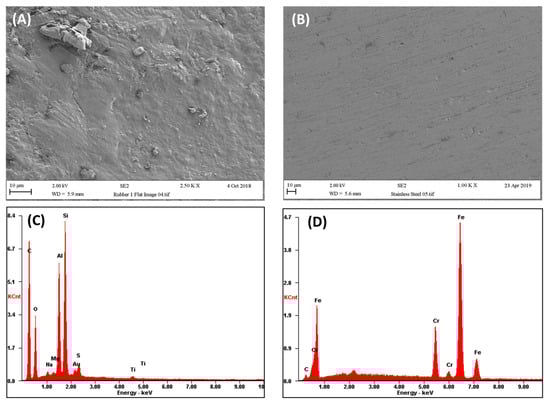 Different properties of some of the surfaces that can become biofouled during the laundering process: (A) topography of rubber seal, (B) topography of stainless steel, (C) elemental analysis of rubber seal, and (D) elemental analysis of stainless steel.