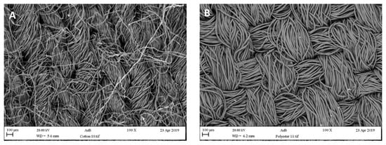 Clothes and textiles represent the main articles cleaned during the laundry process. A clear characteristic of the current textile market is the vast availability of different products. Three types of material can be seen to account for most sales: cotton (40%) (Figure 7A), wool (10%), and polyester mixes (50%) (Figure 7B) [66]. However, microbial contamination has been found on many laundry items and fabrics [4,19,54]. Many factors may influence the removal (detachment and/or inactivation) of microorganisms and also influence the establishment of a resident microflora in washing machines and on clothing. This is important to note as the types of bacteria in the microbial communities will influence the production of malodours [2].