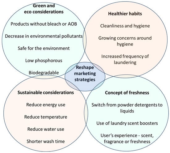 Changing consumer behaviour in relation to sustainability, environmental concerns, and maintaining a healthier lifestyle includes laundry tasks, where the need for better and eco-friendly laundry products has intensified in order to achieve sustainable laundry practices [93] (Figure 8).