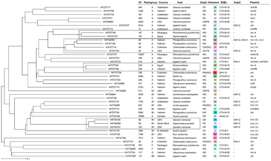 Phenotypic and Genomic Characterization of ESBL- and AmpC-β-Lactamase-Producing Enterobacterales Isolates from Imported Healthy Reptiles