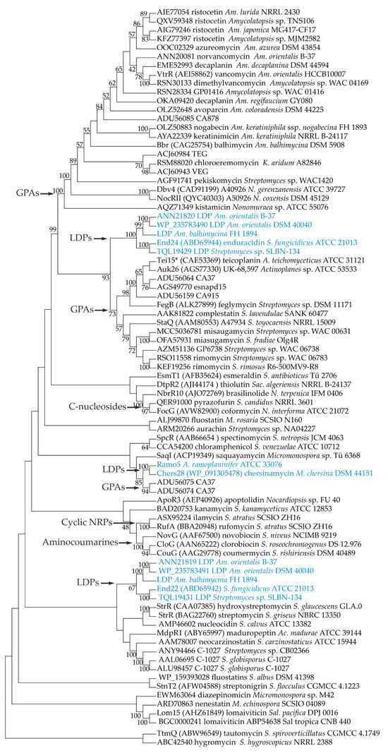 Unrooted maximum-likelihood phylogenetic tree of 83 StrR-like PSRs coded within GPA, LDP (highlighted in blue), and other antibiotic BGCs. Branch lengths were ignored (the tree is represented as a cladogram), and numbers at the nodes show bootstrap support (inferred from 500 bootstraps) of the clade (only those of >40% are shown). Phylogenetic reconstruction was performed using Mega 11 (v. 11.0.13) [50].