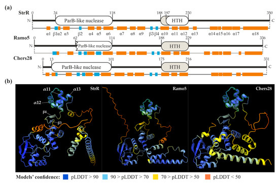 Domain architectures and secondary structures of StrR, Ramo5, and Chers28 (a) as well as models of their tertiary structures (tri-helical HTH DNA-binding domains are highlighted in (b), as predicted with CD-Search [52] and AlphaFold (visualized using Chimera X) [53,55].