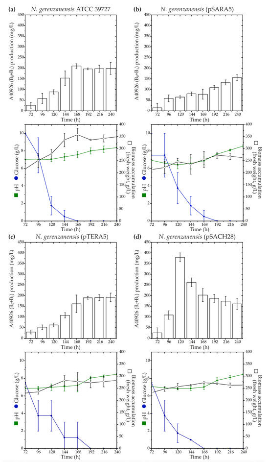 Production time courses of A40926 (factors B0 + B1) along with key growth parameters such as biomass accumulation, pH, and glucose consumption for N. gerenzanensis ATCC 39727 (a), as well as recombinant strains expressing ramo5 and chers28: N. gerenzanensis (pSARA5) (b), (pTERA5) (c), and (pSACH28) (d). Comparison with ATCC 39727 wild type is shown since N. gerenzanensis (pSET152A) and (pTES) had the same production and cultivation parameters as the parental strain. The results are presented as mean values from three independent experiments with error bars representing ±2SD.