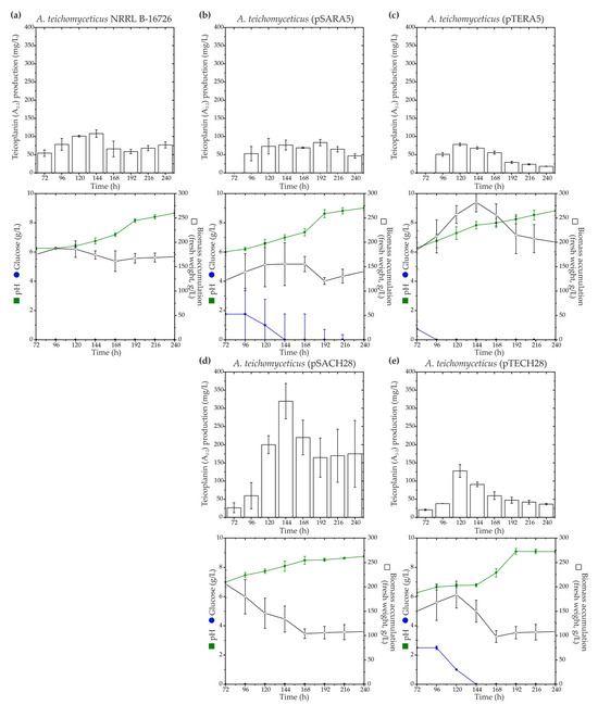 Time courses of teicoplanin (factor A2-2) production along with key growth parameters such as biomass accumulation, pH, and glucose consumption for A. teichomyceticus NRRL B-16726 (a), as well as recombinant strains expressing ramo5 and chers28: A. teichomyceticus (pSARA5) (b), (pTERA5) (c), (pSACH28) (d), and (pTECH) (e). Comparison with NRRL B-16726 wild type is shown since A. teichomyceticus (pSET152A) and (pTES) had the same production and cultivation parameters as the parental strain. The results are presented as mean values from three independent experiments with error bars representing ±2SD.