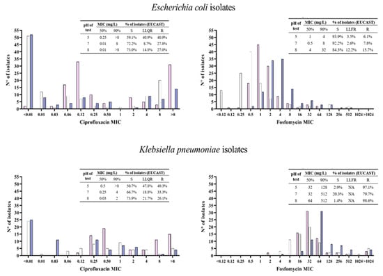2.3. Antimicrobial and Bactericidal Activities of Ciprofloxacin and Fosfomycin against E. coli and K. pneumoniae Clinical Isolates at Neutral, Acidic, and Alkaline pH