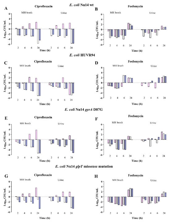 - Martín-Gutiérrez, G.; Rodríguez-Beltrán, J.; Rodríguez-Martínez, J.M.; Costas, C.; Aznar, J.; Pascual, Á.; Blázquez, J. Urinary Tract Physiological Conditions Promote Ciprofloxacin Resistance in Low-Level-Quinolone-Resistant Escherichia coli. Antimicrob. Agents Chemother. 2016, 60, 4252–4258. [Google Scholar] [CrossRef] [PubMed]