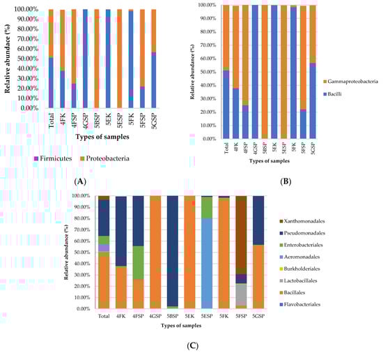 Distribution of bacterial community collected from the patient’s sinks and staff counters at (A) phylum, (B) class, and (C) order levels.