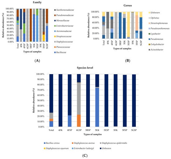 Distribution of bacterial community at (A) family, (B) genus, and (C) species levels in the samples collected from patient sinks and staff counters.