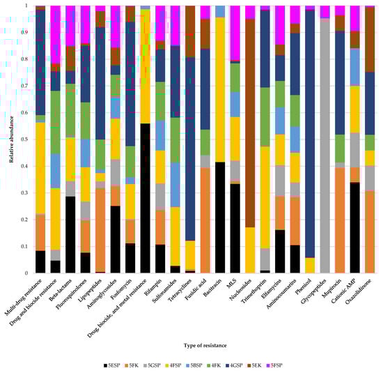 The identification of antibiotic resistance genes conducted through de novo assembly using the AMRPlusFinder database revealed 43 different antibiotic resistance genes (Figure 4) that confer resistance to 20 distinct antibiotic classes. Most of the genes identified in this study shared >98% identity to the ones in the database with >90% coverage (Table S3). Of the 43 antibiotic resistance genes detected, 29 genes were detected from sample 4FSP, and 11 genes from sample 4GSP and sample 4FK. The type of resistance with the highest number of antibiotic resistance genes was resistance to beta lactam antibiotics (n = 11), followed by fosfomycin (n = 7), and cephalosporin (n = 6) (Figure 4).