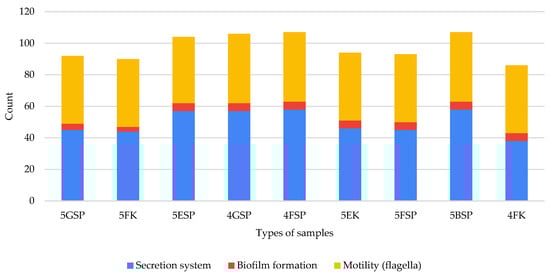 Number of pathways, including those related to secretion systems, biofilm formation, and motility, that virulence factors detected in respective samples are involved in.
