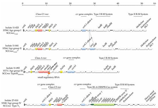 The SCCmec elements of the MSRP isolates analyzed in this study did not encode any virulence determinants other than PSM-mec. However, there were differences in genes and gene clusters between them that may affect bacterial survival and genetic adaptation. Namely, some isolates harbored genes encoding type I and/or type II R-M systems in complete arrays or with truncations, while others had CRISPR loci. ST64 and ST84 isolates had both a type I and a type II R-M system.