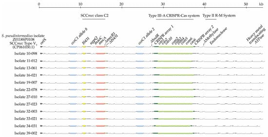 The prediction and characterization of SCCmec types in our selected cohort of 29 MRSP isolates [24] were initiated with the online resource, SCCmecFinder 1.2, (https://cge.food.dtu.dk/services/SCCmecFinder-1.2/, accessed on 27 September 2023) [46]. SCCmecFinder determined that all the submitted MRSP WGS sequences contained the mecA gene. However, it was only able to assign an SCCmec type for six out of seven ST71/Agr group III isolates and 11 out of 12 ST68/Agr group IV isolates (Table 1). A closer inspection of the whole-genome sequences of the non-typable isolates showed that the genes associated with the mec and ccr markers were spread across multiple contigs. Short-read sequencing technology, which was used at the time, often presents problems with full assembly of the entire SCCmec sequence, most likely mediated by multiple insertion sequences [11]. Therefore, we performed long-read WGS for the remaining non-typable isolates. Genomic analyses of the SCCmec elements showed that there was only one dominant SCCmec type in each ST/Agr group. Further details are described below.