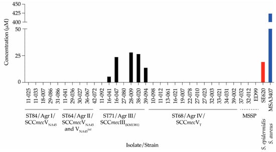 The presence of the psm-mec locus in S. pseudintermedius is generally overlooked and, according to our knowledge, there are no available reports describing PSM-mec protein production in this species. Therefore, we analyzed 16-h culture filtrates from our isolate collection using an established RP-HPLC/ESI-MS method [31]. As expected, PSM-mec could not be detected in filtrates of MSSP isolates lacking an SCCmec element (37-032, 32-012, and ED99) or any isolate lacking the psm-mec locus (ST84/Agr group I, ST64/Agr group II, and ST68/Agr group IV) (Table 1; Figure 3). Notably, PSM-mec production was exclusive to the ST71/Agr III group that harbored SCCmec III(KM1381), which correlates with the presence of the psm-mec locus from our WGS data analyses (Table 1; Figure 3). The production levels of PSM-mec in these isolates from the ST71/Agr III group ranged from 5 to 27 μM, which is in the range of production in the S. epidermidis isolate SE620, while the clinical S. aureus MSA3407, a documented high producer of PSM-mec, produces more than 20-fold more PSM-mec than all the S. pseudintermedius isolates. Five of the seven psm-mec-gene-positive isolates were PSM-mec producers. The two psm-mec-gene-positive isolates that did not show PSM-mec production were also δ-toxin-negative, which is indicative of a dysfunctional Agr system (Table 1) [56]. The absence of PSM-mec production in those isolates is thus expected, assuming that Agr controls psm-mec expression in S. pseudintermedius as it does in S. aureus [43].