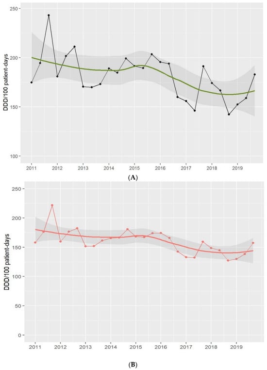 Antimicrobial (A) and antibiotic (B) use in the ICU. Period 2011–2019. Footnotes: Each dot represents the antimicrobial (black-(A)) and antibiotic (red-(B)) use in defined daily doses (DDD)/100 patient-days. The solid lines (green and red) are smooth curves obtained from the consumption data points using a local polynomial regression model (LOESS). The shaded areas represent the 95% confidence intervals of the LOESS curve.