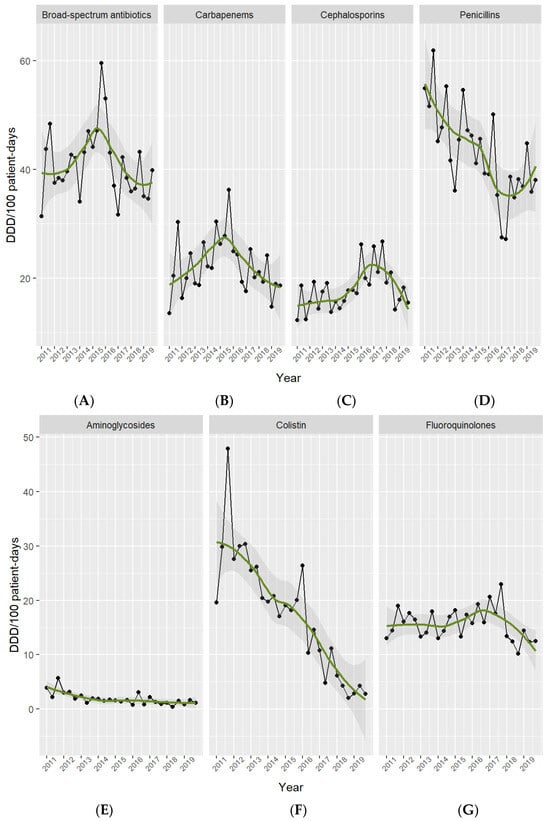 Antibiotic use per drug class in the ICU. Period 2011–2019. Footnotes: Broad-spectrum antibiotics (A) include meropenem, imipenem, piperacillin-tazobactam, and cefepime. Carbapenems (B) include meropenem, imipenem, and ertapenem. Cephalosporins (C) include cefuroxime, ceftriaxone, ceftazidime, and cefepime. Penicillins (D) include cloxacillin, penicillin G, ampicillin, amoxicillin-clavulanate, and piperacillin-tazobactam. Aminoglycosides (E) include amikacin, gentamicin, and tobramicin. Colistin (F). Fluoroquinolones (G) include ciprofloxacin, levofloxacin, and moxifloxacin.