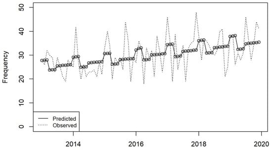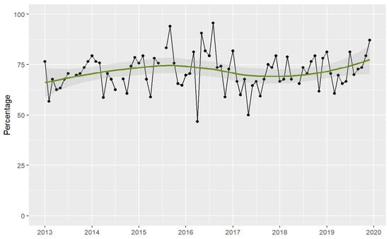 Moving average plot of appropriateness of antibiotic prescribing in the ICU in the period 2013–2019.
