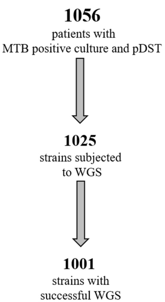 One thousand and fifty-six MTB strains were collected during a 6-year period, from 2016 to 2021. All strains were identified by molecular methods and processed using pDST, according to the routine diagnostic procedure in use in the laboratory. Of these strains, 1025 (955 obtained from respiratory samples, 93%) were processed by WGS, and good quality sequences (suitable for bioinformatics analysis) were obtained for 1001 strains (Figure 1).