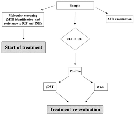 Diagnostic algorithm for TB used at the INMI Institute. The clinical sample undergoes microscopic examination of acid-fast bacilli (AFB), traditional culture, and first-line molecular screening for MTB and INH resistance. Results of molecular biology testing performed on primary samples are taken into consideration in case of discordance with DST on the isolate.
