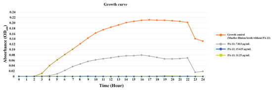 Bacterial survival after MIC testing was examined. After being transferred into a normal saline solution (0.85% NaCl), the E. coli in the culture media were properly mixed. A 0.5 McFarland standard (108 CFU/mL) was used to measure the turbidity of the bacterial sample. Each well of the triplicate assays utilized 48-well plates containing 500 µL of bacterial suspension diluted in a Mueller–Hinton broth (Difco, Reno, NV, USA) to 106 CFU/mL. This was combined with 500 μL of appropriate dilutions of PA-13 at the concentrations of 0× (growth control), 0.5×, 1×, and 2× of MIC. With the microplate spectrophotometer (BMG LABTECH, SPECTROstar Nano, Ortenberg, Germany), which was used to measure the OD600 values every hour for a 24 h period at 37 °C, a growth curve was constructed.