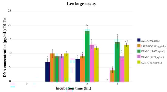 The leaking of E. coli DNA depended on the different concentrations of PA-13 (Figure 2). When comparing DNA leakage at different MIC values, the highest one was found two hours after the incubation. Comparing the leakage of DNA among different concentrations at 2 and 3 h of incubation, E. coli treated with PA-13 at a MIC value of 15.625 µg/mL showed the most significant DNA leak.