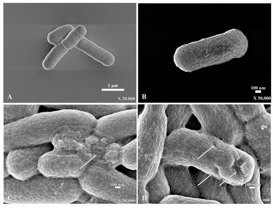 For the scanning electron micrograph, E. coli that were incubated without PA-13 showed a normal morphology and rod shape with no traces of rupture on the bacterial surface (Figure 3A,B). However, E. coli incubated with PA-13 at 15.625 µg/mL for 2 h and 37 °C showed surface rupture (Figure 3C,D).