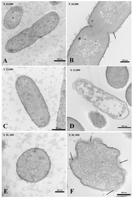 The longitudinal and cross-section of the transmission electron micrograph of E. coli both treated with PA 13 at 15.625 µg/mL (B,D,F) and untreated (A,C,E) for 2 h at 37 °C. E. coli were visibly ruptured (B,F; black arrow) and unable to maintain their rod shape (D,F), and there was a loss in the cytoplasmic content (D).