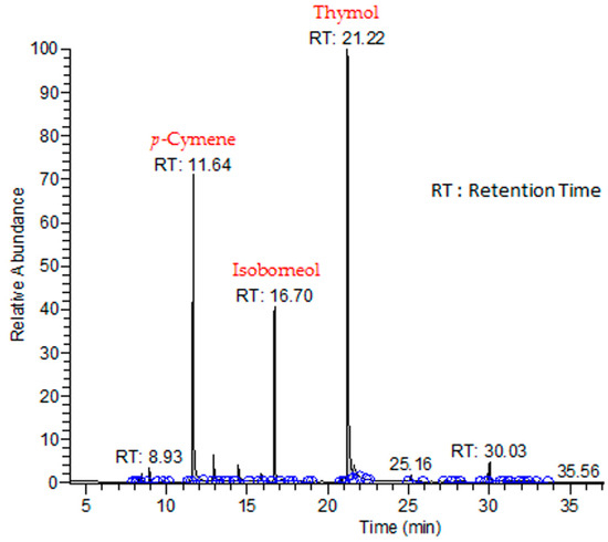 Regarding T. zygis essential oil (TZEO), the chromatographic analysis (Figure 2) picked out 32 compounds that represent 98.51% of total compounds of the essential oil (Table 1). The three most important compounds accounted for a total of 65.86%, namely thymol (40.67%), p-cymene (26.07%), and isoborneol (13.62%). The identified chemical compounds of TZEO were classified into oxygenated monoterpenes (62.52%), hydrogenated monoterpenes (31.31%), oxygenated sesquiterpenes (3.69%), and hydrogenated sesquiterpenes (0.99%). These chemical compositions were putatively determined.