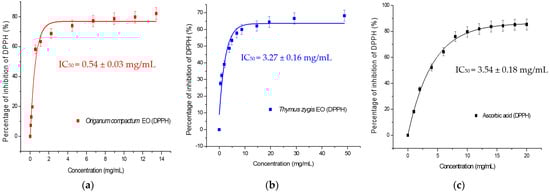 Antioxidant capacity of the essential oils by DPPH (1,1-diphenyl-2-picrylhydrazyl). (a) Origanum compactum EO; (b) Thymus zygis EO; (c) Ascorbic acid. IC50 = Half maximal inhibitory concentration.