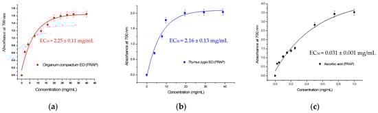 Antioxidant capacity of the essential oils of Origanum compactum and Thymus zygis assayed by FRAP (Ferric Reducing Antioxidant Power). (a) Origanum compactum EO; (b) Thymus zygis EO; (c) Ascorbic acid. EC50 = Half maximal effective concentration.