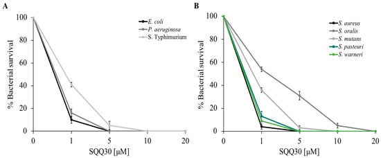 SQQ30 antimicrobial activity. Tests were performed against different bacterial strains at different concentrations (0–20 µM) in three independent experiments. Gram (−) panel (A) and Gram (+) panel (B). Standard deviations were always less than 10%.