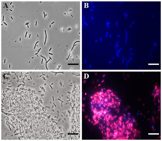 DAPI/PI dual staining images obtained via the fluorescence microscopy (FM) of E. coli untreated (A,B) or treated (C,D) with peptide SQQ30. Scale bars: 1 µm.