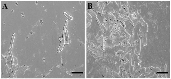 The SEM observations confirmed that the target of SQQ30 was the membranes (Figure 3). In fact, it is possible to observe that—when compared to untreated sample (Figure 3A)—treated cells (Figure 3B) appear crushed and emptied of cellular contents, losing their characteristic three-dimensionality.