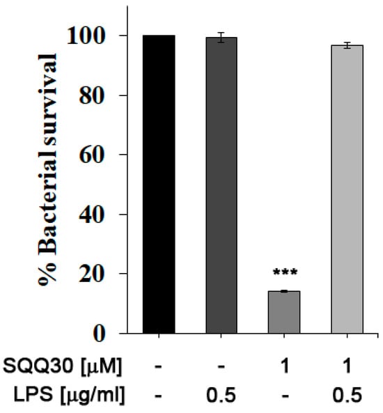 Antimicrobial assay against E. coli. Bacterial cells were incubated with E. coli LPS, SQQ30, or LPS + SQQ30. The assays were performed for three independent experiments. The error bars indicate a SE of the mean (n = 3). Statistical analysis was performed using a two-tailed paired t-test (*** p ≤ 0.001) versus untreated cells.