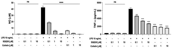 Effects of SQQ30 and colistin on the release of pro-inflammatory mediators via RAW 264.7 cells (murine macrophages). Where indicated, RAW 264.7 cells were stimulated with LPS from E. coli 0111:B4. The data presented were the mean values of three independent experiments. The error bars indicate ± SD values. Statistical analysis was calculated using a two-tailed paired t-test (ns is not significant, *** p < 0.001, **** p < 0.0001).