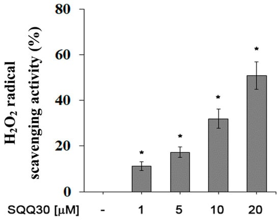 SQQ30 antioxidant activity. This graph shows the hydrogen-peroxide scavenging activity. The assays were performed for three independent experiments. The error bars indicate the SE of the mean (n = 3). Statistical analysis was performed using a two-tailed paired t-test (* p ≤ 0.05) versus untreated cells.