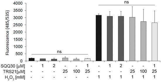 In addition, to assess SQQ30′s effect on oxidative stress, we pretreated HaCat cells with SQQ30 for 24 h. A reactive oxygen species (ROS) detection assay demonstrated that neither alone nor in concomitant treatment with TRS21 does SQQ30 induce oxidative stress (Figure 8). In addition, we tested whether SQQ30 may have an effect in the presence of hydrogen-peroxide-induced oxidative stress.