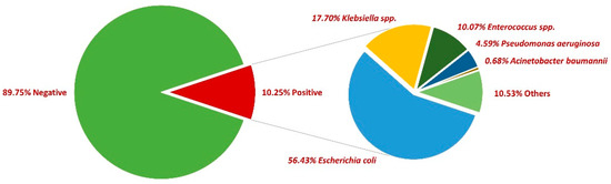 First, 54,114 midstream urine samples collected between 2018 and 2022 were examined, with a positivity rate of 10.25% (5548). More than two-thirds of positive samples were collected from female patients (73%). The most common pathogen incriminated was E. coli (56.43%), followed by Klebsiella spp. (17.70%), Enterococcus spp. (10.07%), Pseudomonas aeruginosa (4.59%), and Acinetobacter baumannii (0.68%). In what concerns the rest of the positive urine samples, other bacteria were incriminated, such as Enterobacter spp., Proteus spp., Morganella morganii, and Staphylococcus saprophyticus, etc. (Figure 1).